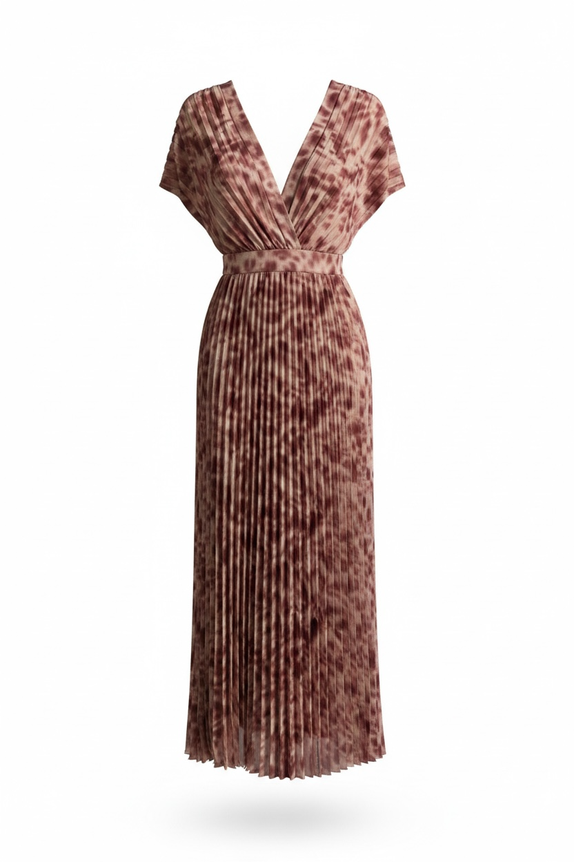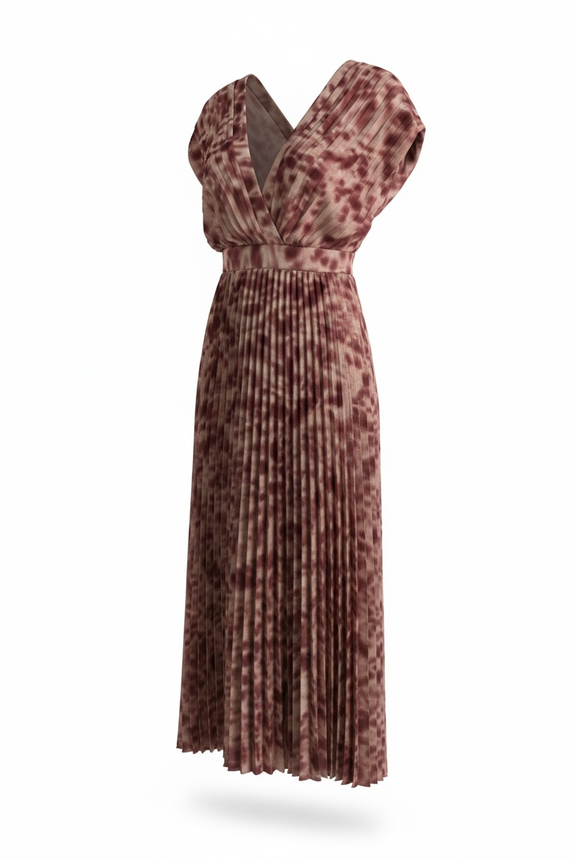 Flowing maxi dress with soft draping, a defined waist, and an open back.