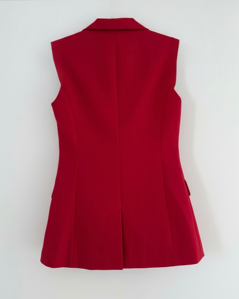 A tailored two-piece set featuring a sleeveless blazer and straight-leg trousers.